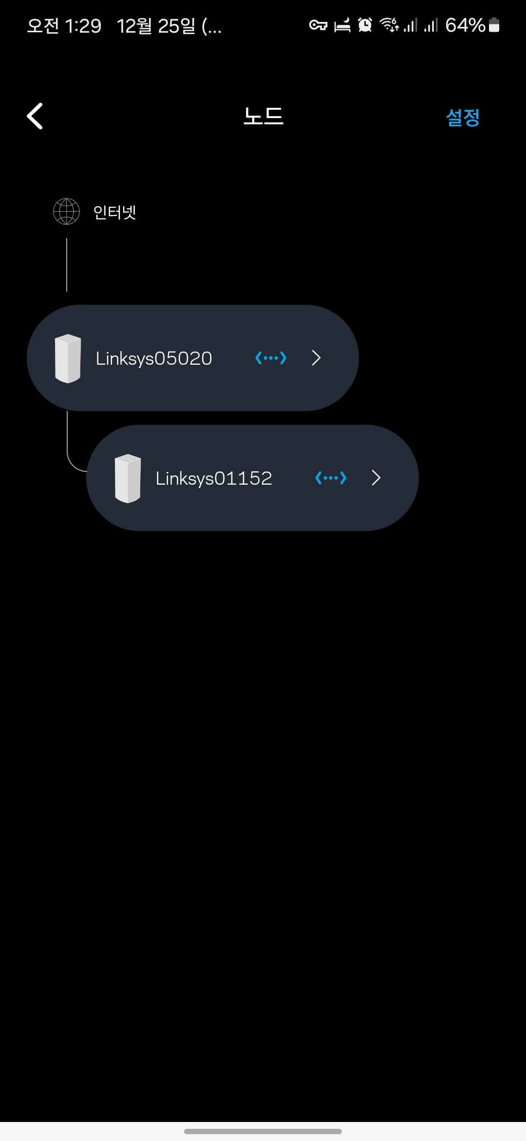 이거 폰으로 공유기 페이지에 들어가기가 불편해서 하위노드 기존 세팅 날리고 보라색 초기설정 들어가기 위해 물리적으로 리셋하고 한다고 좀 통상적인 방식보다 어렵게 했네요. 결정적으로 메인이랑 하위 둘 다 순차적으로 재부팅하고 난 다음에야 성공했고… 역시 작업은 유선 추천… 대신 폰으로는 공유기 관리자 페이지 대신 앱을 계정 만들어서 사용가능