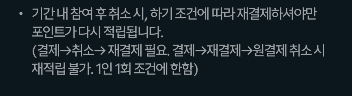 어느날 보니까 취소되어있길래 고객센터에 재결제 순서는 내가 정할수있는것도 아니고 결제 재결제 취소 시간 30초도 안걸렸는데 뭐가 문제냐 문의했더니 재적립해줬습니다.