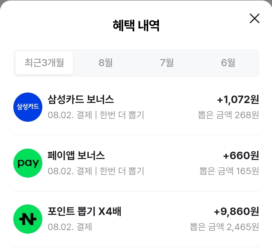 어느정도 정착되니 횟수를 줄이네요 기존 삼성카드 결제 시 한번 더 기회를 주는 프로모션도 종료할런지 궁금하네요