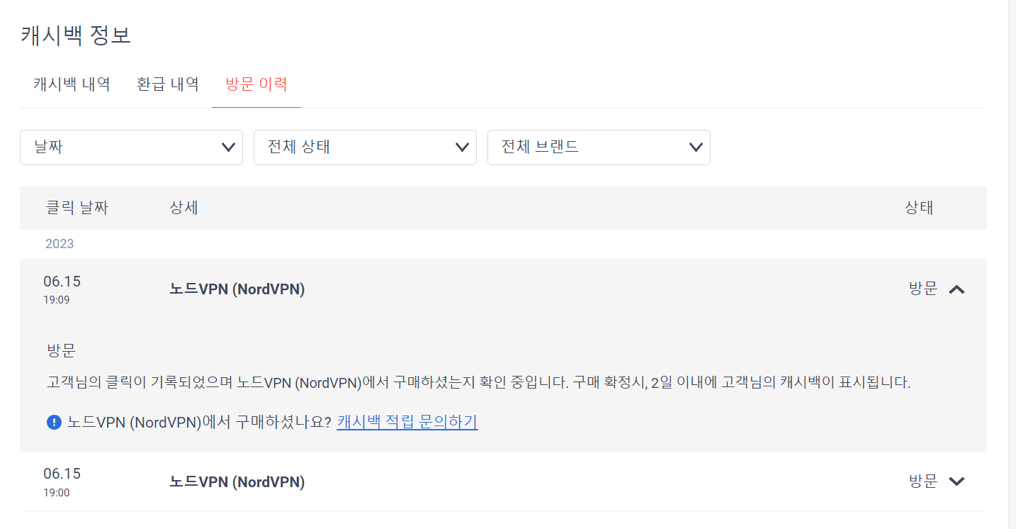 정보를 보고 샵백 확장 프로그램 설치해서 초록색으로 변한 걸 확인하고, 노드 vpn 가입하고 결제했는데 샵백에 방문이력만 있는 거 맞는 거겠죠? 무료vpn으로 가끔 일본 경유하고 그랬는데 덕분에 잘 사용하겠습니다~