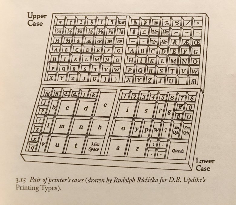 인쇄 활자 케이스 윗쪽엔 대문자, 아랫쪽엔 소문자를 넣어서 저렇게 불렸다네요.
