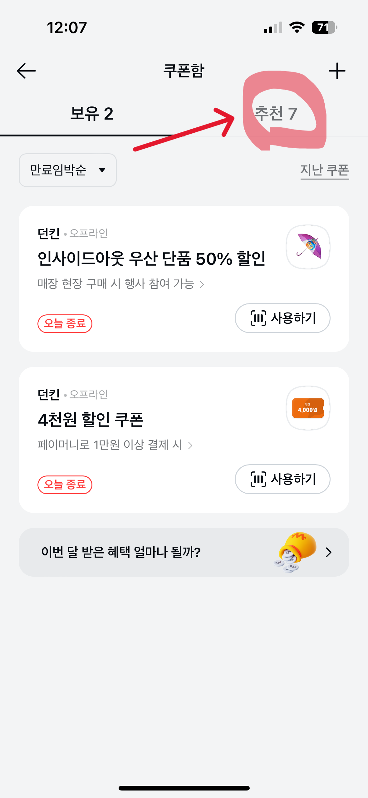 그리고 아래 사진처럼 추천으로 가시면 던킨 쿠폰 다운을 받을 수 있습니다.
