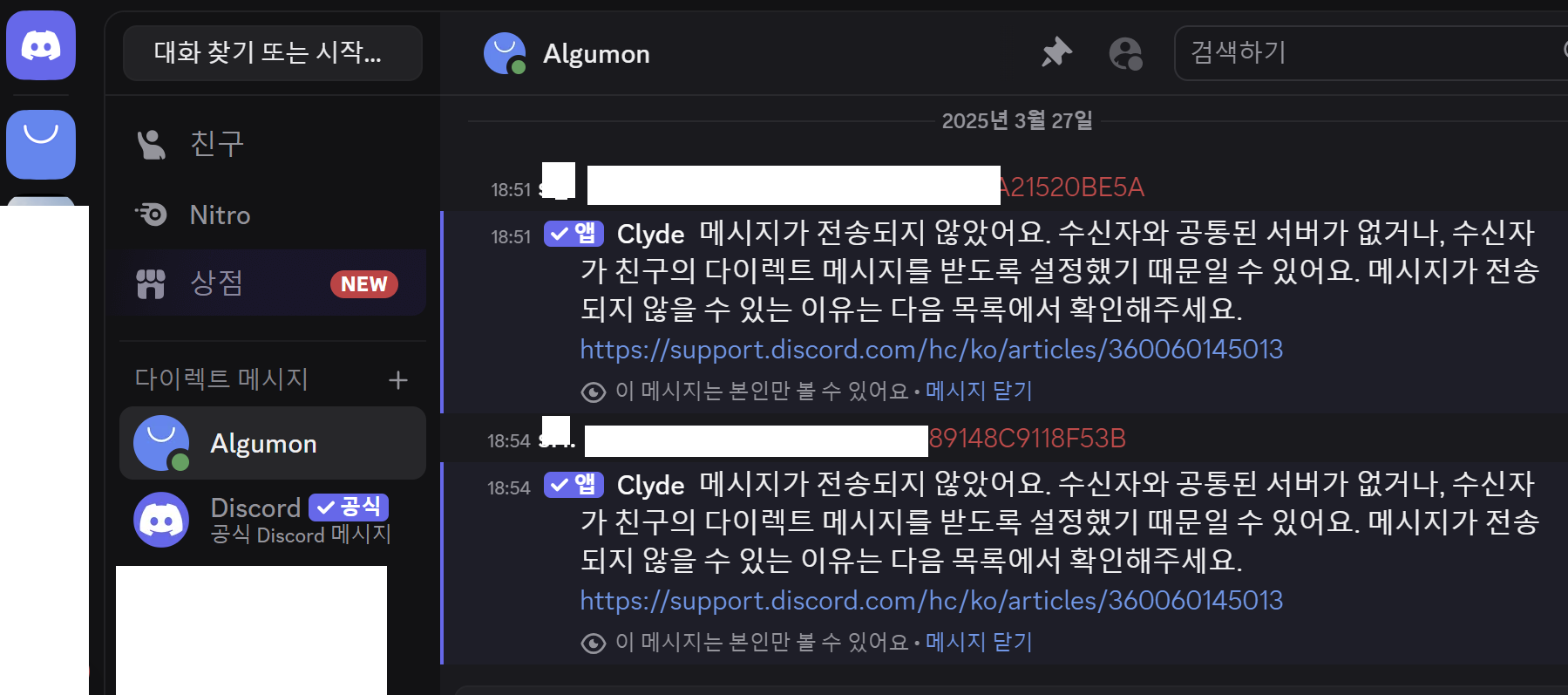 혹시 서버에서 ‘개인 메시지 허용’ 설정이 켜져 있는지 확인 부탁드려도 될까요?