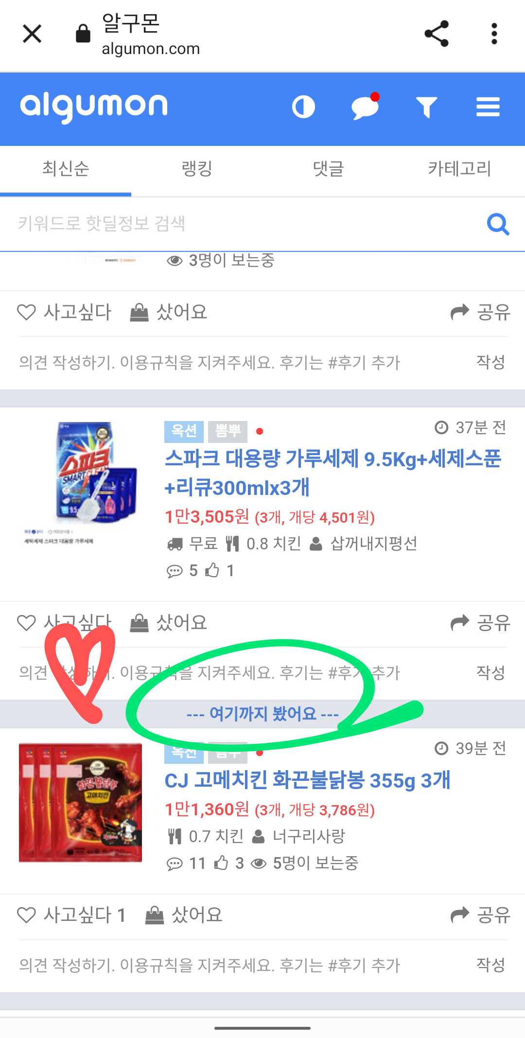 - 로그인 되어있는 경우, 내가 마지막으로 봤던 글을 “여기까지 봤어요” 라고 표시해서 알려드려요