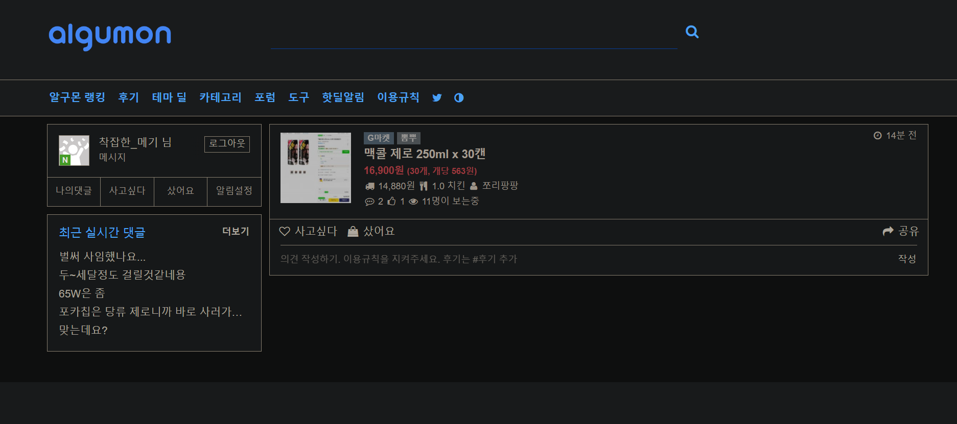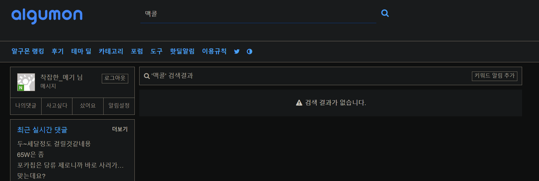 맥콜을 검색하면 아무런 결과가 나오지 않습니다. 시놀로지의 경우 1년전 정보가 최신으로 뜹니다. 알구몬 랭킹에 있는 정보 대부분이 메인 페이지에 나타나지 않습니다.