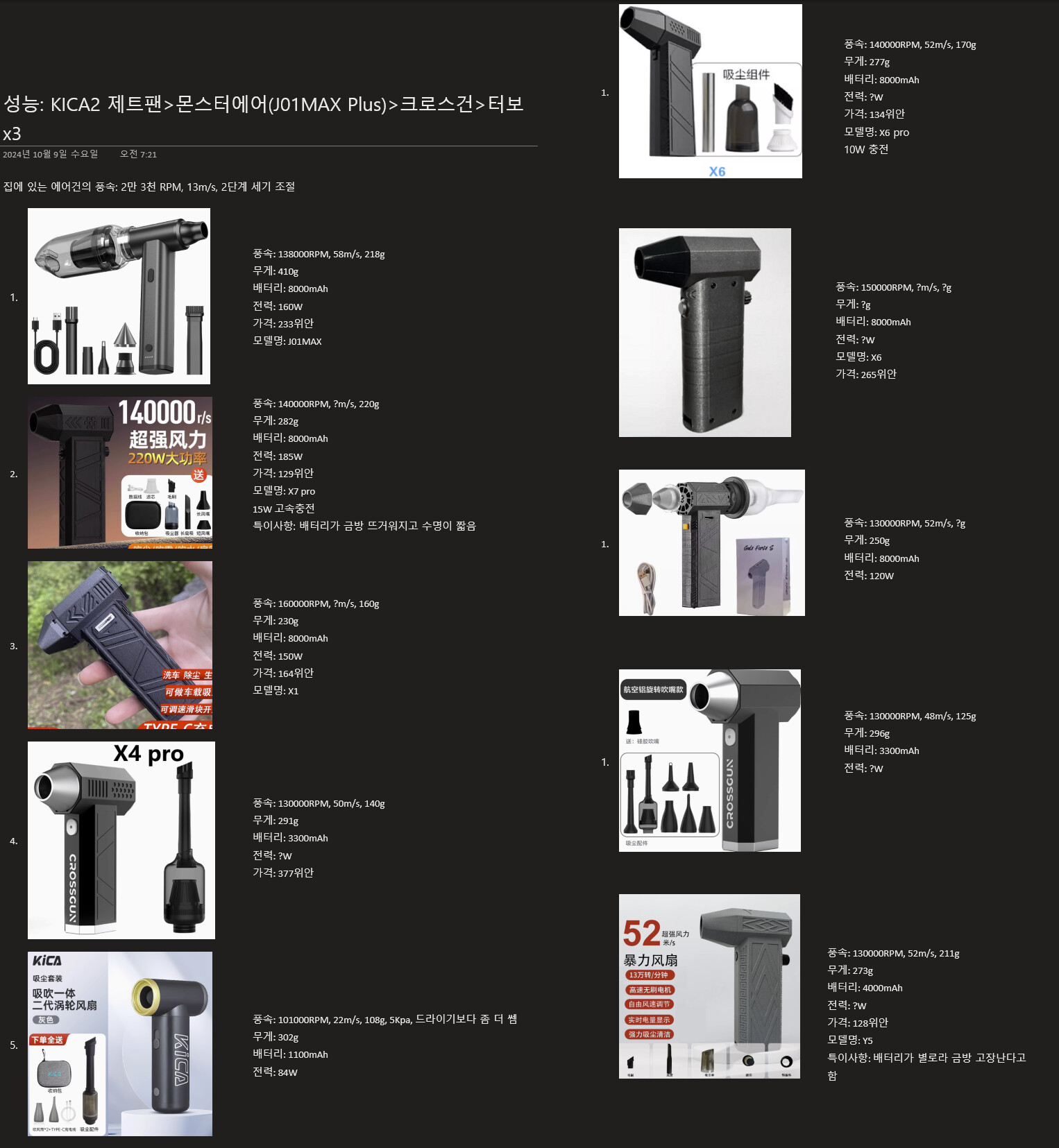 제가 에어건 사려고 한창 타오바오서 찾고 정리한 정보랑 비슷하네요. 윈코가 카이카랑 같고 풍력도 90g인걸 보면 아마 카이카 1세대 같네요. 크로스건도 세대가 많이 있는데, 개발자님이 사신 건 흡입 악세사리가 없긴 하지만 X4랑 똑같이 생긴 거 보면 잘 구매 하신듯. 전 슬라이드형 풍향 조절과 더 큰 배터리를 원해서 다른 걸로 샀는데, 그때 크로스건으로 샀으면 눈물 흘렸을 거 같네요ㅋㅋ 요새 크로스건이 엄청나게 할인 많이 하더라고요. 저 앞부분 자석으로 붙이는 건 크로스건만 있는 기능이라 돌려서 끼워야 하는 제 꺼보다 편할 듯. 원래는 카이카 최신 버전이 몬스터에어보다 풍력은 강한데 크기는 오히려 더 작아서 구매하고 싶었는데, 흡입 기능이 없어서 포기했네요.