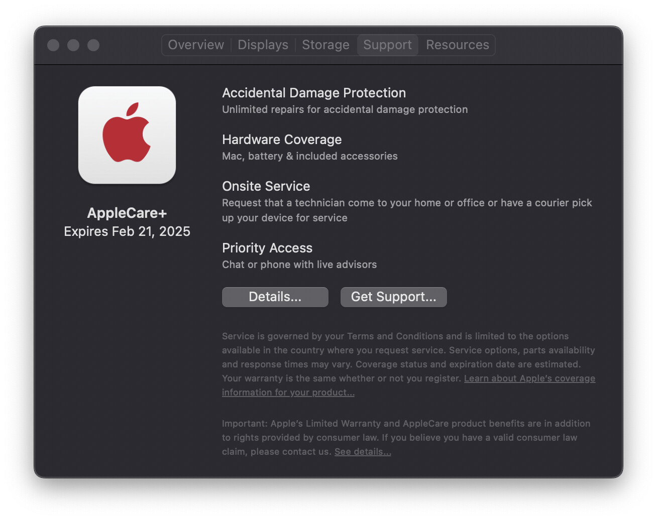 (행사 한참전에 애케플을 들여놓은 저의 2021 맥북프로 16인치의 보증 정보가 변경된 화면입니다 )