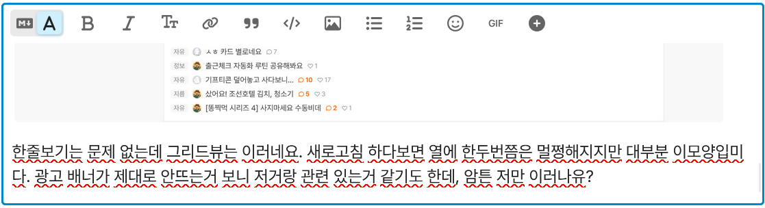 한줄보기는 문제 없는데 그리드뷰는 이러네요. 새로고침 하다보면 열에 한두번쯤은 멀쩡해지지만 대부분 이모양입미다. 광고 배너가 제대로 안뜨는거 보니 저거랑 관련 있는거 같기도 한데, 암튼 저만 이러나유?