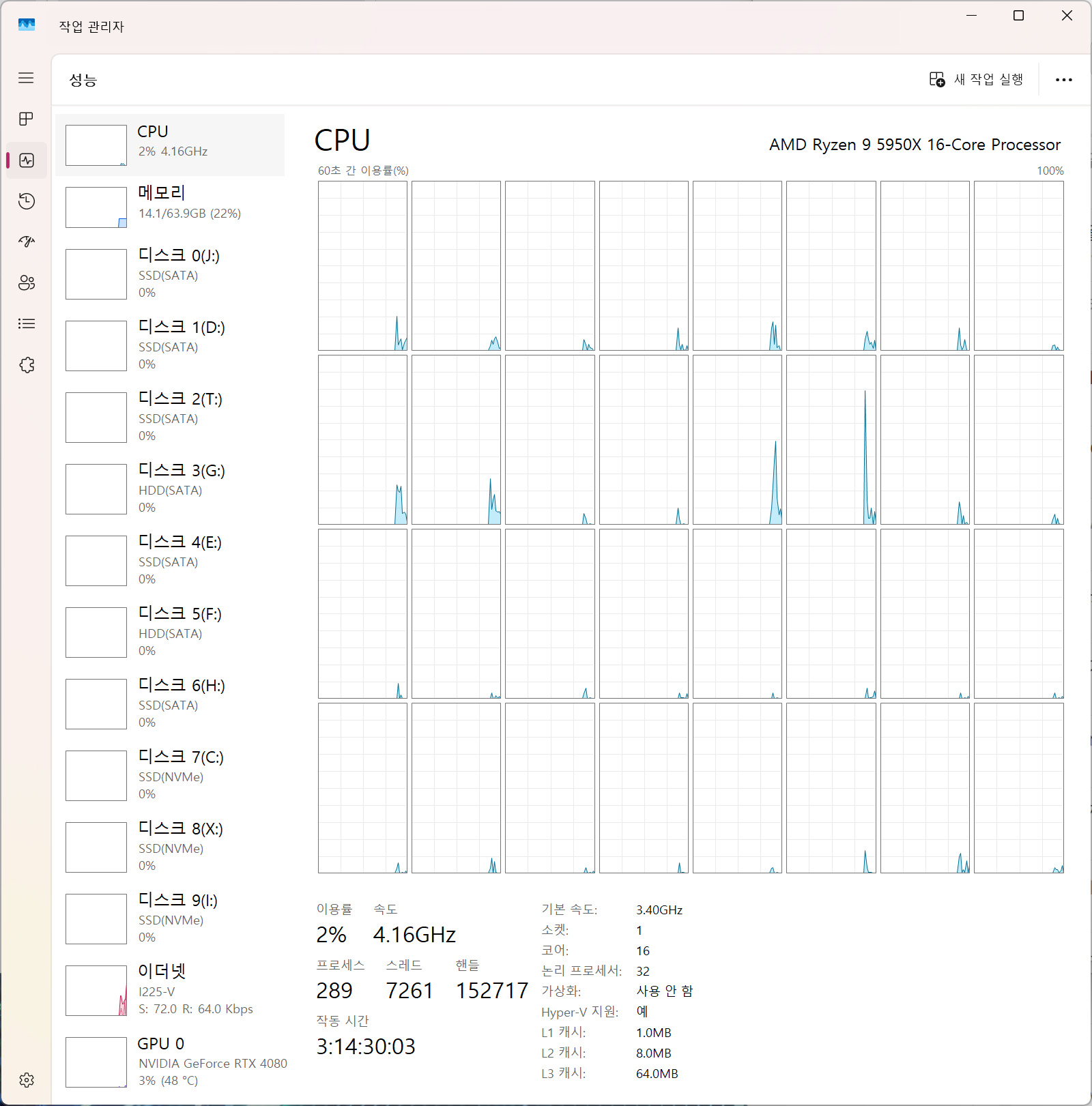 파일 창고로 쓰는 다른 콤푸타에는 11개 달려있고 (SSDx2, HDDx9) 아직 빈 포트가 열 세개 남았습니다 촤하.