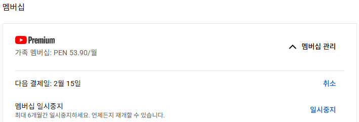 특이하게 유튜브 앱 내에서는 갱신이 되지 않고 갱신취소 라고나오네요