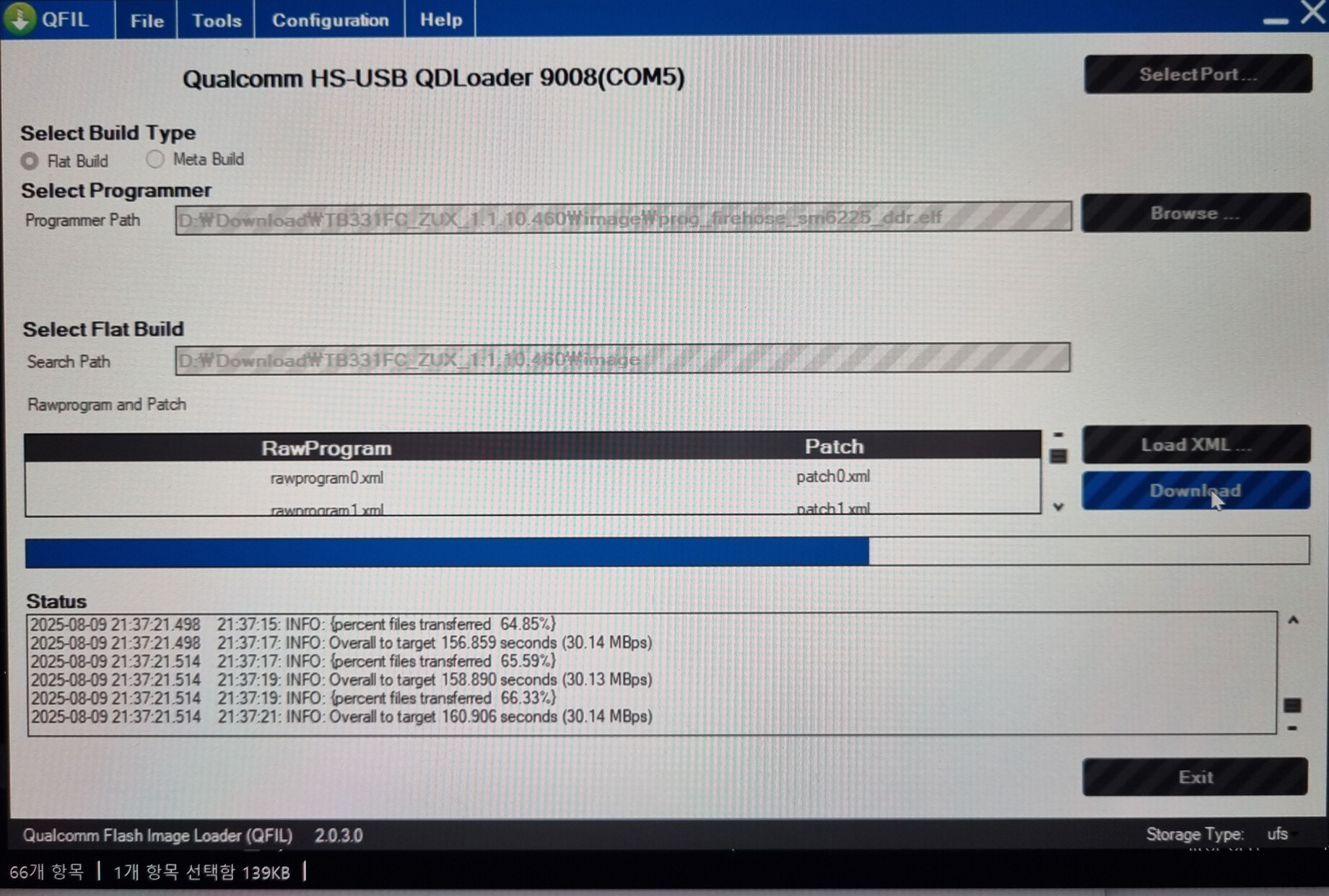 5차례 시도 끝에 노트북이 USB를 인식…여러 재료를 넣고 Download!! 롬파일을 적용합니다.