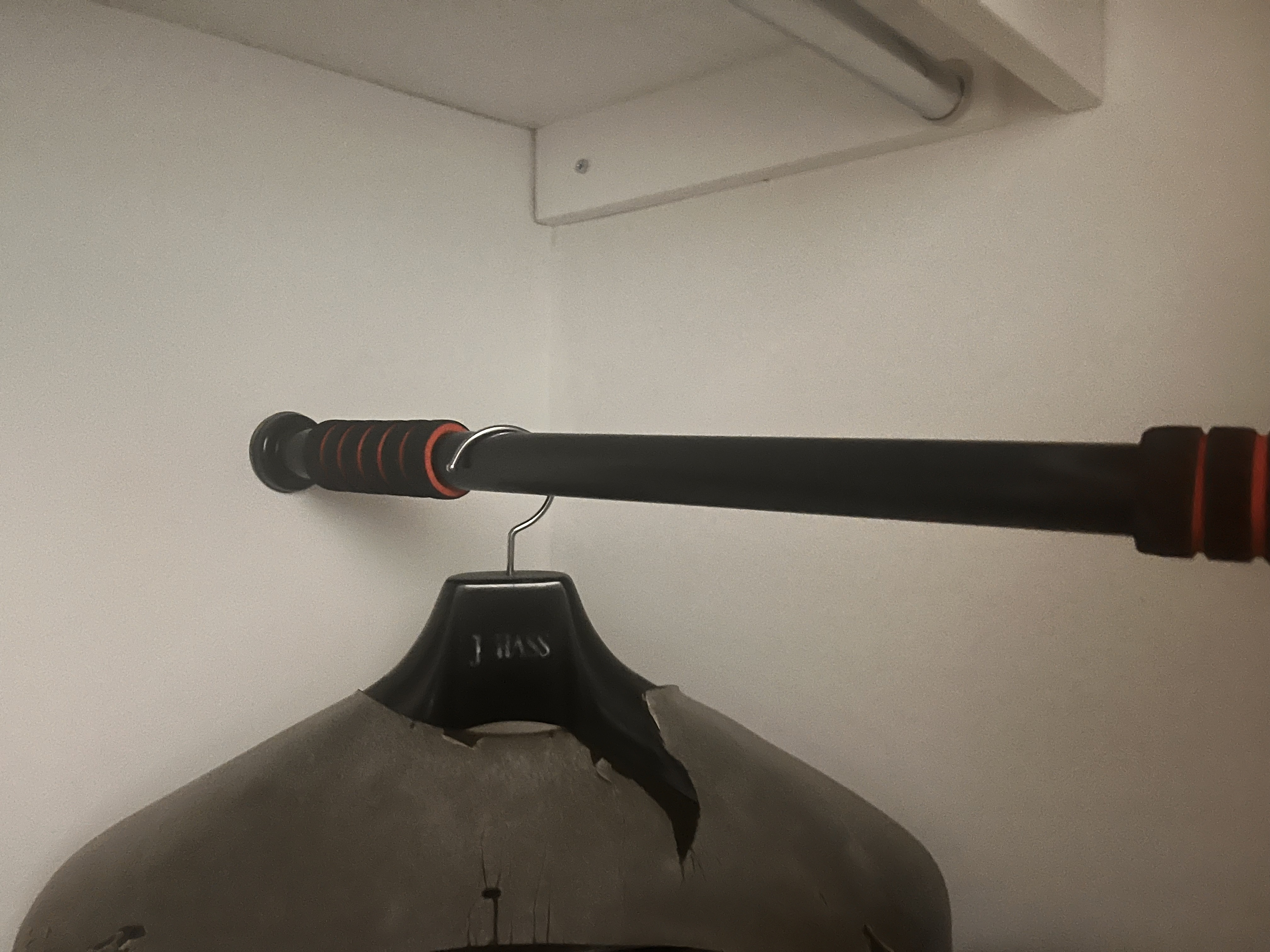 문틀철봉은 턱걸이의 고려대상에서 아슬아슬 아웃! 이라는 느낌이라면, 옷 거는 압축봉으로 턱걸이를 하겠다고 하면 세배로 미친 사람 취급을 받겠지요 따라서 둘중에 튼튼한 건 상대적으로 문틀철봉이다!!!