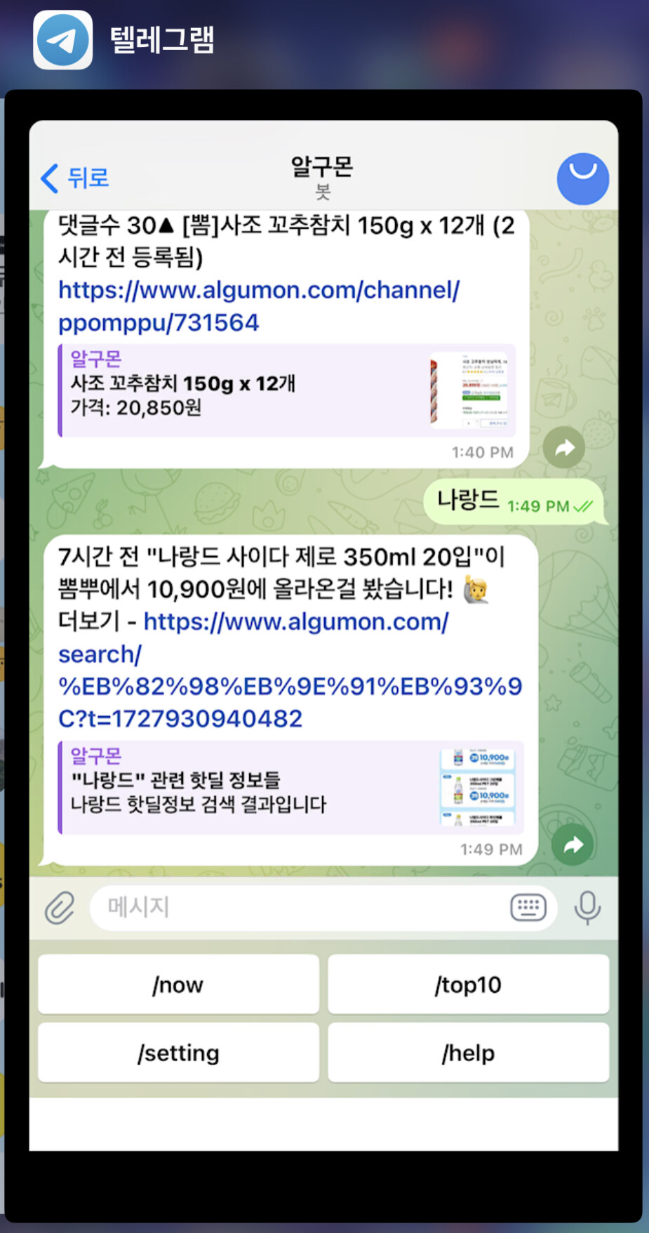 사진은 텔레그램 앱에서는 스샷도 안되서 강제 종료 하려고 멀티테스크 상태에서 찍었습니다.
