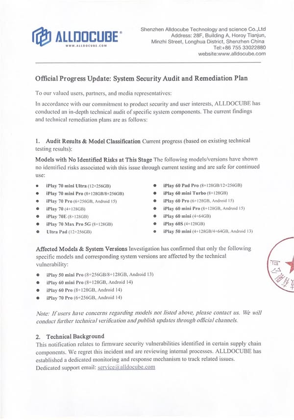 확인된 감염 기기에는 Alldocube iPlay 50 mini Pro(T811M)가 포함되며, Kaspersky는 "여러 브랜드"의 태블릿에서 감염을 확인했으나 Alldocube 외 제조사명은 공개하지 않았습니다.