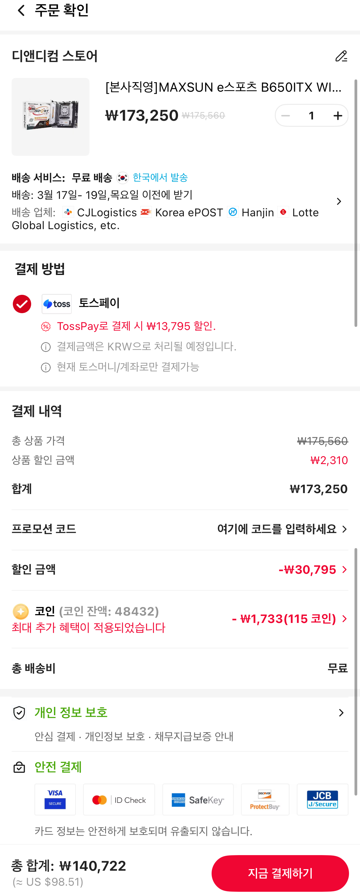 가성비 SFF용 ITX보드인데 AEKS11 쿠폰에 토스페이 할인, 소소하게 코인까지 적용하면 14만 원 나옵니다. 직구도 아니고 정발 제품인데 이 가격이 나오네요. 스펙이 화려한 제품은 아니지만, 9950X 같은 전기돼지 사용할 게 아닌 이상 8코어까지는 그냥저냥 쓸만합니다. 라이저도 크게 가리지 않고, 알려진 특별한 이슈도 없습니다. 단, 딱 하나 아쉬운 게 바이오스 업데이트 방법이 좀 거지 같다는 문제였는데, 작년 말에 나온 바이오스 이후로 메이저 제조사들처럼 EZ플래시 지원합니다.