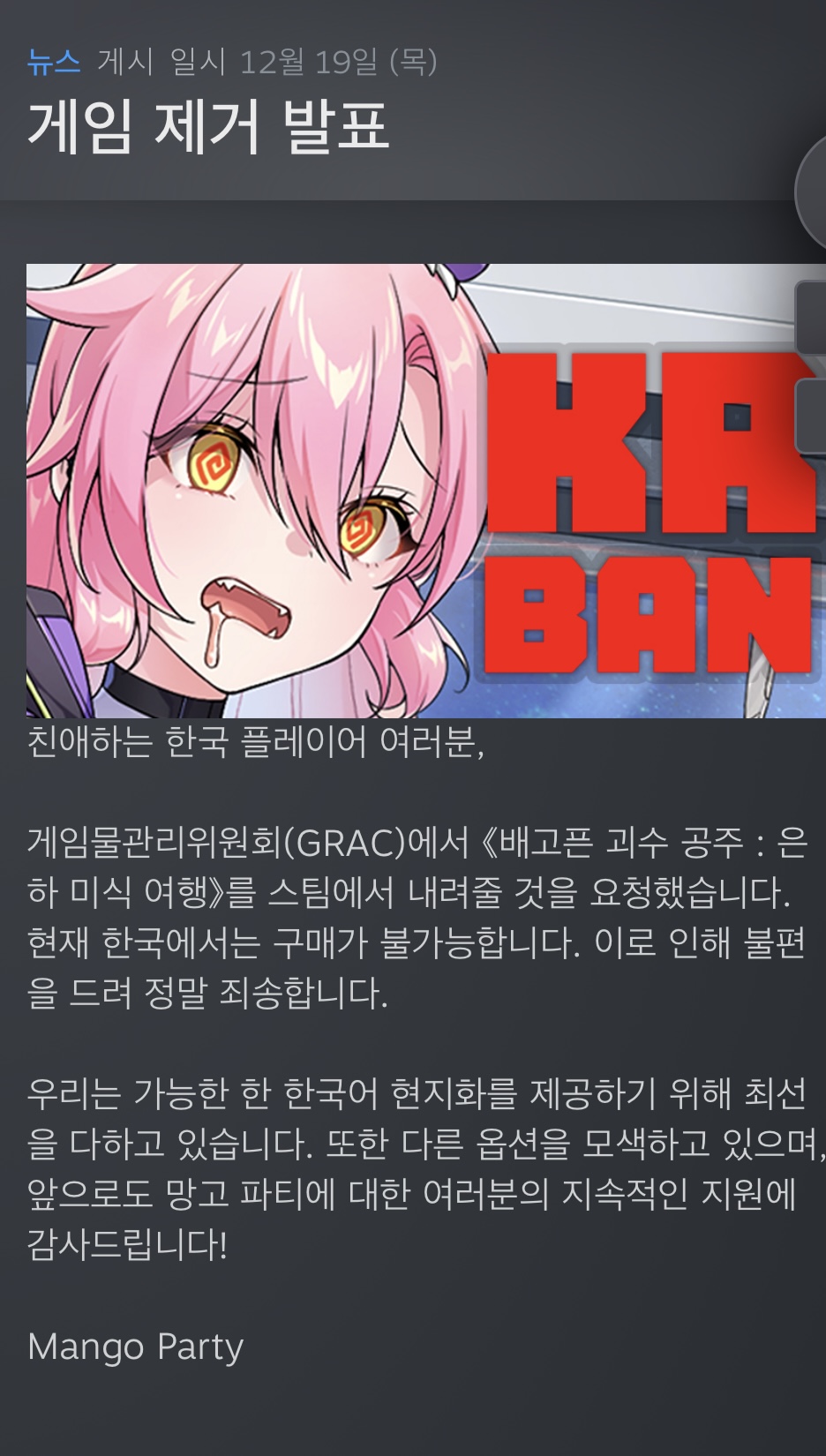 게임물관리위원회(GRAC)에서 《배고픈 괴수 공주 : 은하 미식 여행》를 스팀에서 내려줄 것을 요청했습니다. 현재 한국에서는 구매가 불가능합니다. 이로 인해 불편을 드려 정말 죄송합니다.